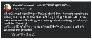 नयाँ वर्षको अवसर पारेर संयुक्त प्रेस विज्ञप्ति जारी गर्दै पार्टीको साधारण सदस्य समेत नरहने गरी जिम्मेवारीबाट अलग भएको घोषणा गरेका हुन् । नेकपा कानेपोखरी–४ का अध्यक्ष चुडामणि भारती, कोषाध्यक्ष कन्तलाल राजबंशी, सह–सचिव बसन्ती ऋिसिदेव, वडा सदस्यहरु लगायतका जिम्मेवार नेताहरूले राजिनामा दिएको हो । नेकपा कानेपोखरी–४ का पार्टी अध्यक्ष चुडामणि भारतीले आफ्नो फेसबुकमा विज्ञप्ती जारी गर्दै सामूकि राजीनामा दिएको सार्वजनिक गरेका थिए ।